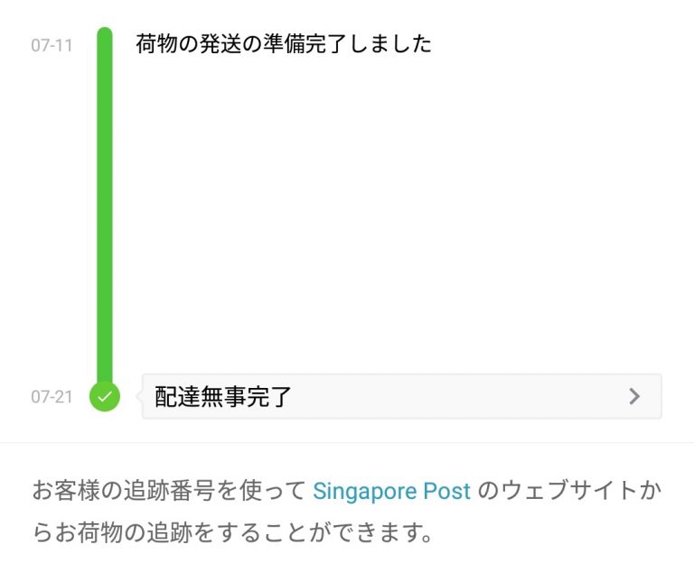 一週間経って中国を出発、しばらくしてシンガポール、また一週間後にシンガポール出発、またしばらくして税関、税関から3、4日くらいで到着、こんな感じです。調べた感じもっとかかることもあるっぽいので、気長に待ちましょう。