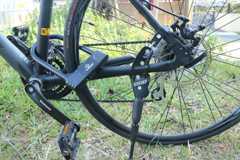 フラットバーのクロスバイクという時点ですでにロードバイクより盗難のリスクは低いはずですが、これに加えてスタンドがついていることで自転車の醸し出すガチ感が軽減されます。