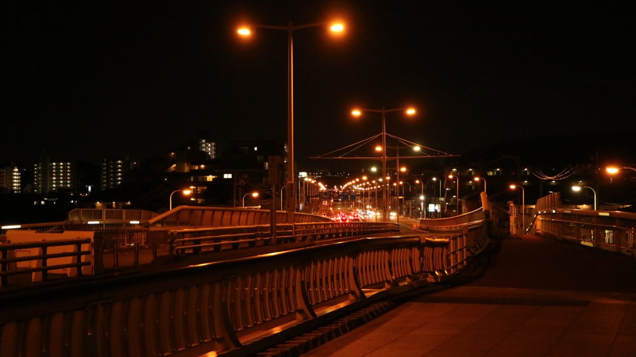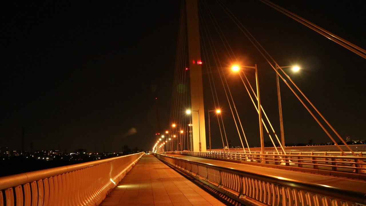 もう真っ暗ですが多摩川を超えました。橋がきれいですがそんなことはどうでも良くなるくらいおしりと膝が痛かったです。
