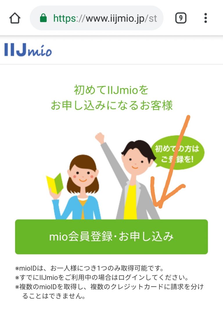 初めて登録すると思うので、「mio会員登録・お申し込み」をタップ。