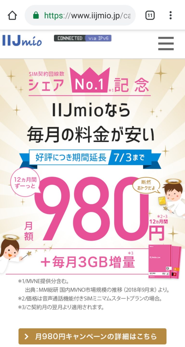※2019/7/2までIIJmioはすごいキャンペーンをやっているので申し込むなら絶対今すぐやったほうが良いです。