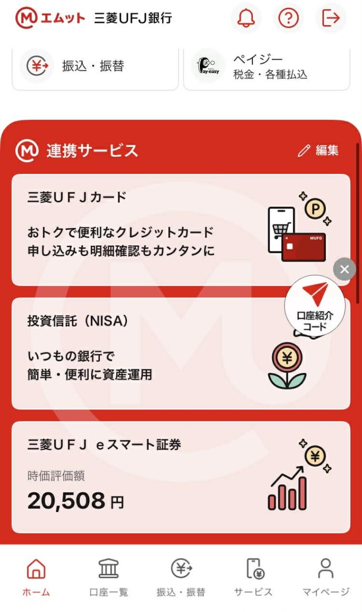 これも簡単です。三菱UFJダイレクト(銀行のアプリ)にログインするだけです。