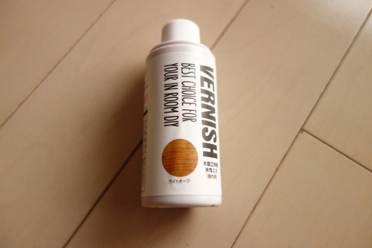 次に百均で木材用の塗料を買ってきました。以前商品撮影用ボードを作った際に使ったウォルナット色が良かったのでそちらと迷いましたが、同じ色だとつまらないのでこちらのライトオークにしました。