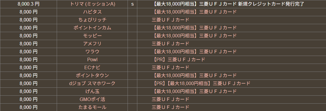 今見た感じだと、三菱UFJカードはどこも8000円なのでこういう場合はモッピー一択ですね。