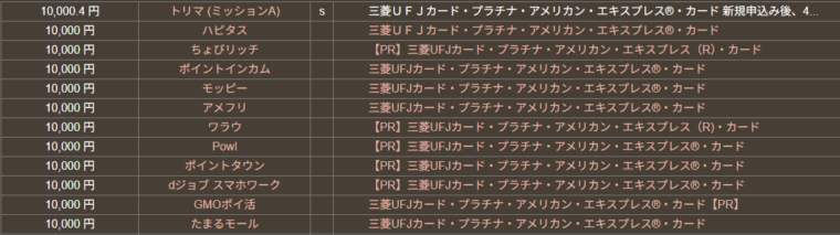 三菱カード プラチナアメリカンエキスプレスも10000円で横並びなので、これもモッピー一択。