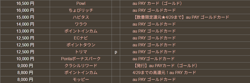 au payカードはサイト間で大きく差があり、モッピーは8000円なので30%の交換レート差を加味しても他サイトのほうがお得なので、他サイトにします。今回はPowlがお得そうですね。