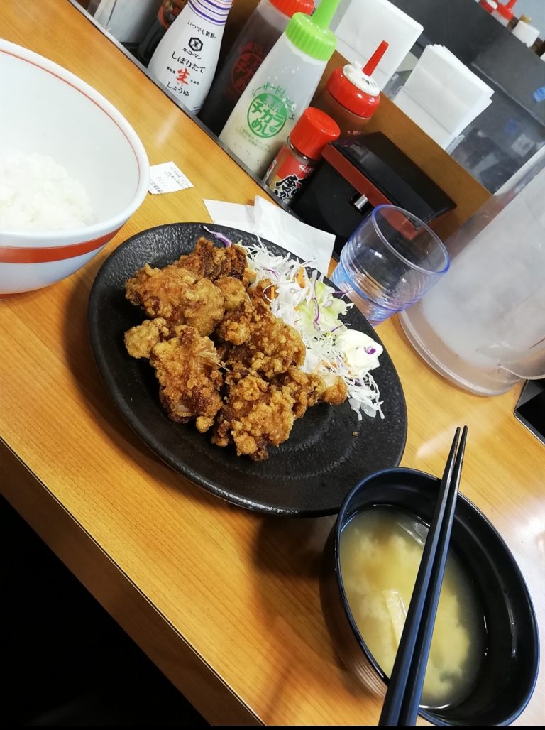 唐揚げ定食の内容は、唐揚げが8個ほどとキャベツが一緒に乗った大皿と、ご飯とお味噌汁の付け合わせでした。ご飯はおかわりし放題だそうですが、お腹がいっぱいだったので結局おかわりしませんでした。